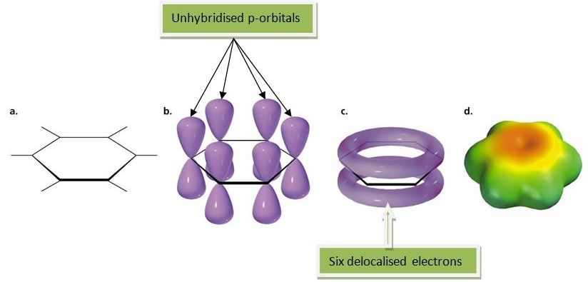 However, the structure of benzene is better understood by the overlapping of the orbitals. The hybridization of all the carbon atoms in benzene is sp^2. The overlap of the two sp^2 hybrid orbitals of one carbon with those of those of the adjacent carbon atom results in the formation of C-C sigma bonds. The other sp^2 orbitals of the carbon atom overlap with the s-orbital of the hydrogen atom. The overlap between sp^2 orbital of carbon with s-orbital of hydrogen results in the formation of C—H sigma bonds. There are six C-C sigma bonds and six C—H sigma bonds. One unhybridized p-orbital of each carbon atom, perpendicular to the plane of the ring, is left;