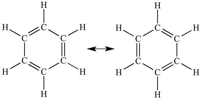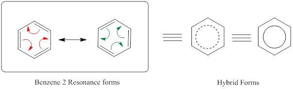 Benzene exists as an intermediate of different resonating structures. The following two structures, proposed by Kekule, represent the canonical forms: