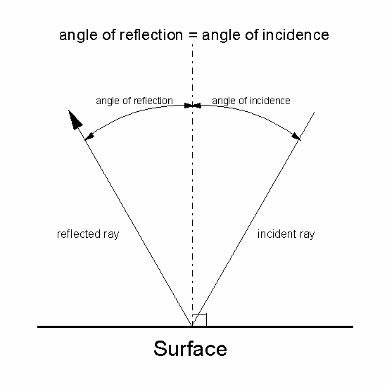 Once the ray of light strikes a surface of an object, it forms an angle of incidence and the angle of reflection.