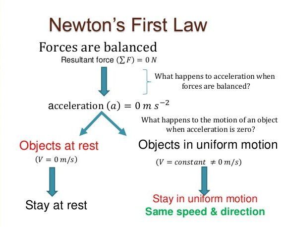 The first law of motion states that every body continues to be in its state of rest, or of uniform motion in a straight line unless it is compelled by some external force to change that state.
