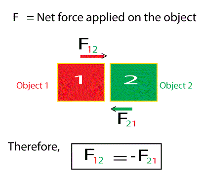 - If two objects interact, the force, F12, exerted on the object 1 by the object 2 (called action) is equal in magnitude but opposite in direction to the force, F21, exerted on the object 2 by the object 1 (called reaction).