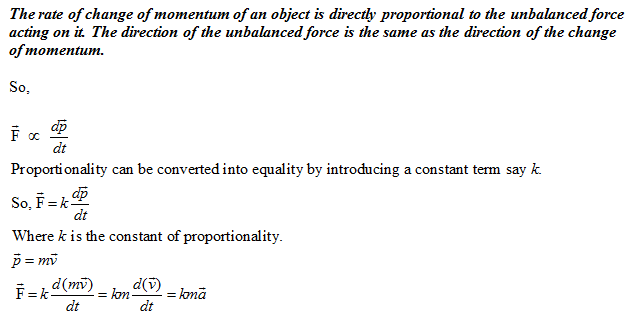 - The force applied is directly proportional to the mass of the body and acceleration.