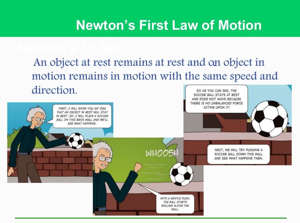 - A body which is at rest continues to be in that state. In order to make it move, an external force has to be applied to it.
