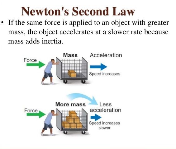 The second law of motion states that the acceleration of a moving body depends upon the mass of the object as well as the force acting on the object; F= ma, where,
